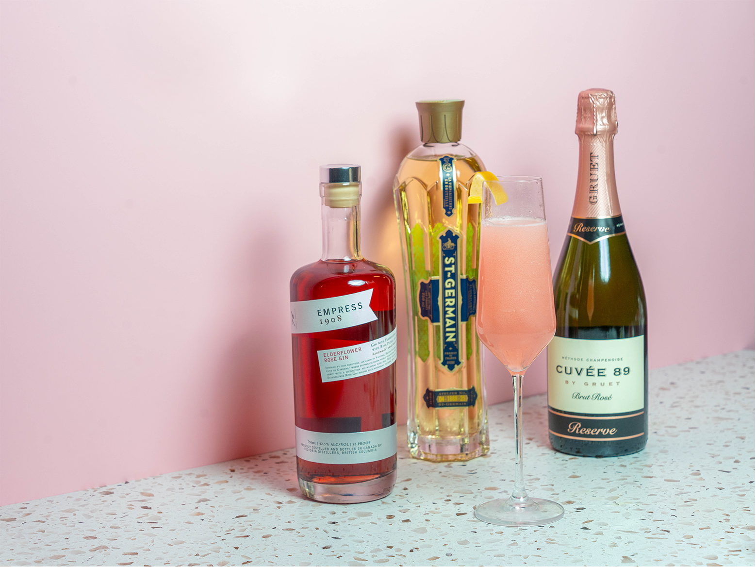 In a cocktail shaker filled with ice, combine the gin, elderflower liqueur, lemon juice, and rose syrup.